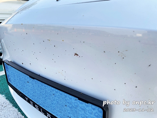 차량 앞범퍼에 무수히 붙어 있는 벌레 흔적들 ㄷㄷ💀