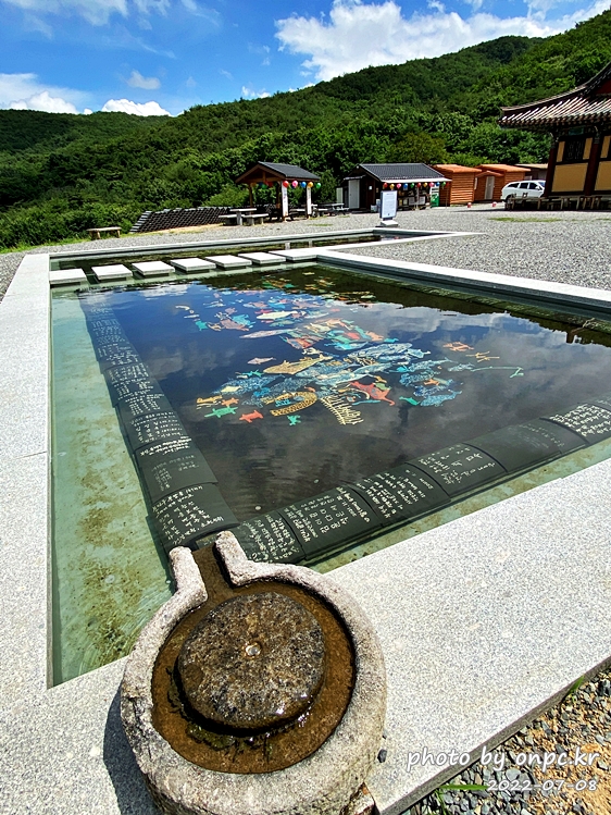 사찰 앞마당에는 옻칠과 나전칠기 공법으로 완성된 작품을 수조에 전시하고 있습니다. 가까이 가봐요~ go