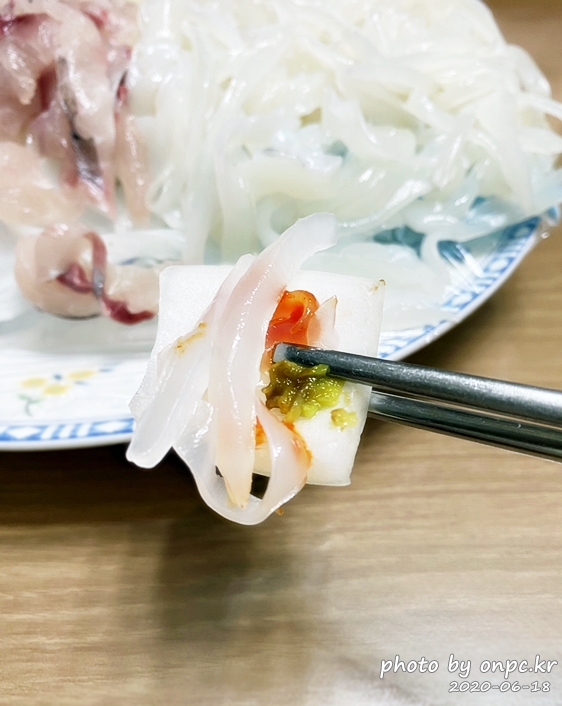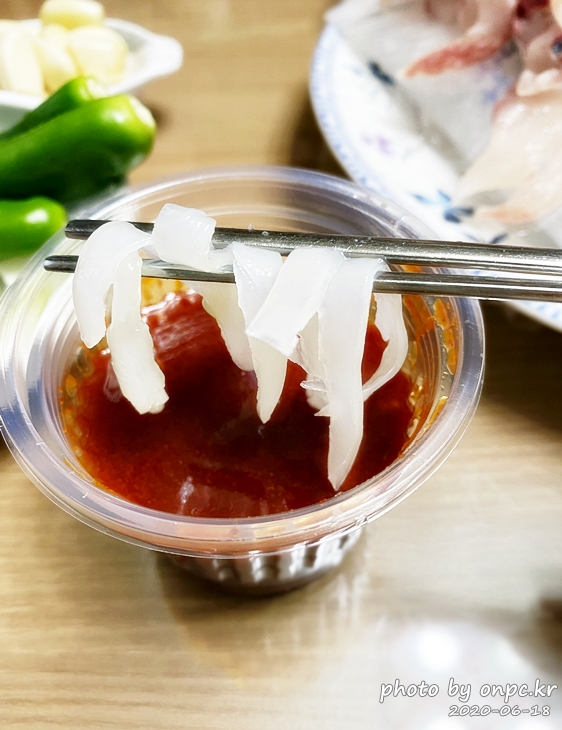 식감 좋고 정말 맛있는 갑오징어회~ 고추냉이 간장에도 초장에도 다 맛있어요 ㅋ