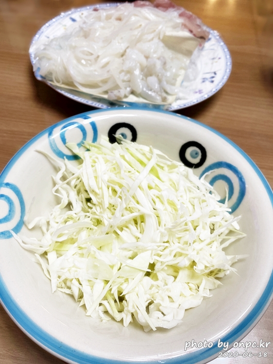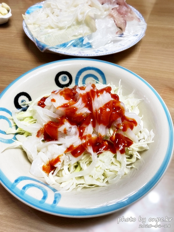 양배추 슬라이스 위에 갑오징어 수북이 올리고~