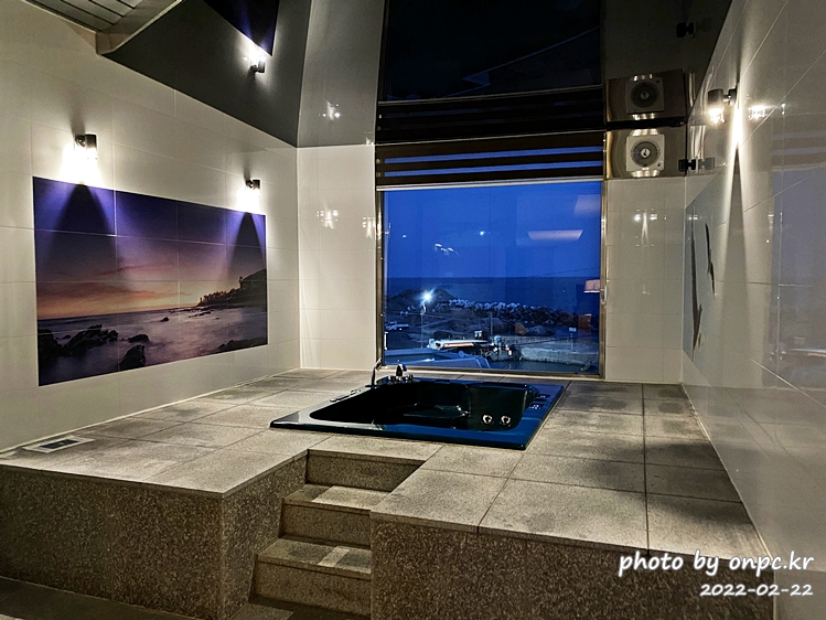 바다가 잘 보이게 살짝 높여서 욕조가 있어요. 통창 너머 시원한 바다와 밤바다 풍경을 보며 오션뷰 스파를 즐길 수 있어요.