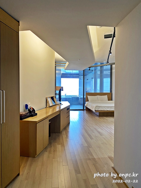 안으로 들어서면 한편에 침대와 가구들~ 그리고 넓은 유리창으로 분리된 공간에 대형 욕조가 보여요.