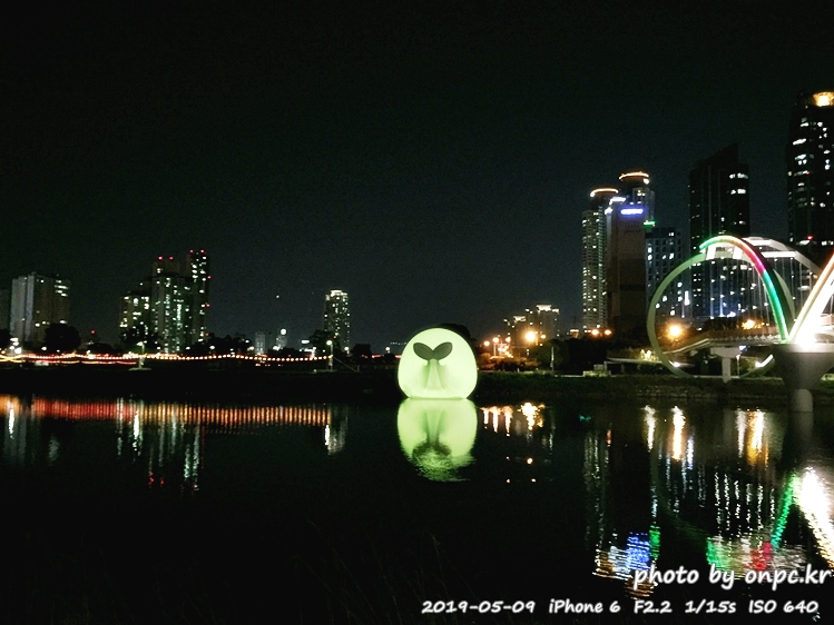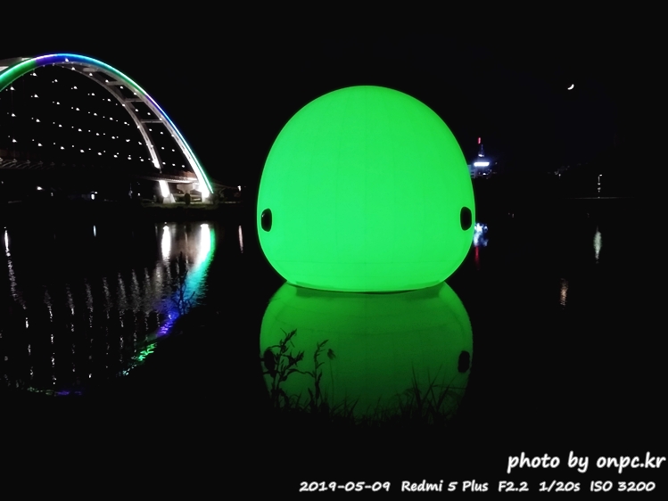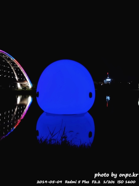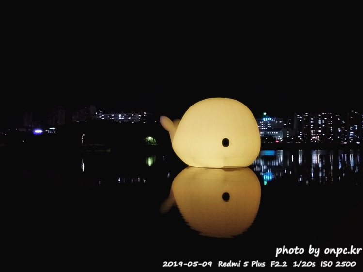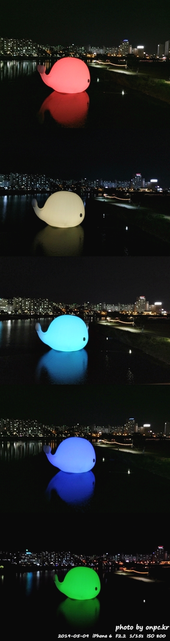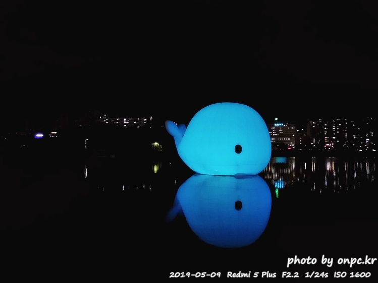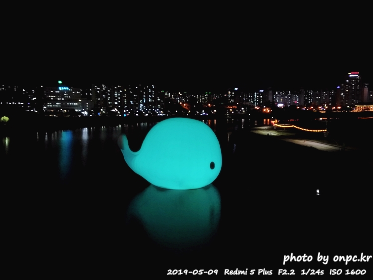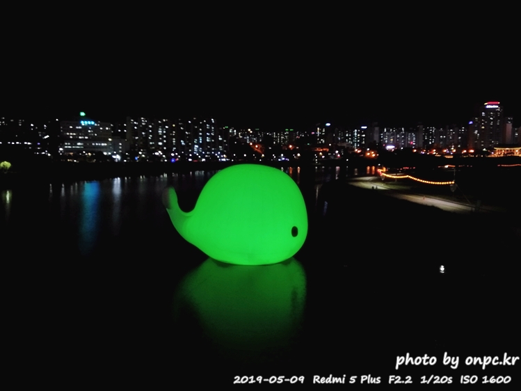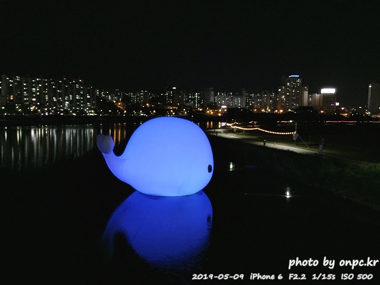 낮에는 흰고래가 떠있고 밤에는 아름다운 색으로 변하는 고래가 떠있는 풍경~