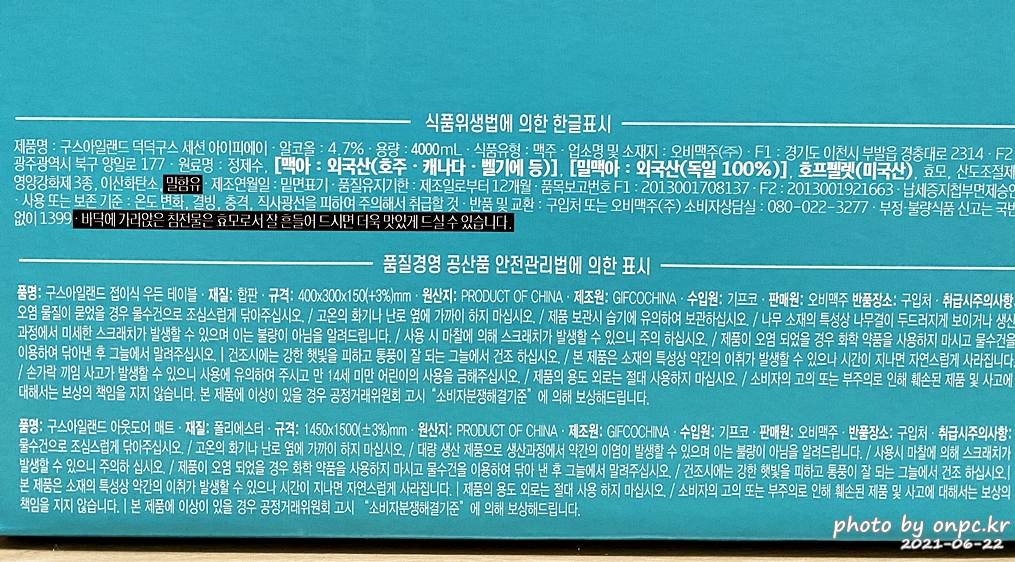 원료명: 맥아: 외국산(호주, 캐나다, 벨기에 등), 밀 맥아: 외국산(독일 100%), 호프 펠렛(미국산)... 등 참고하세요~