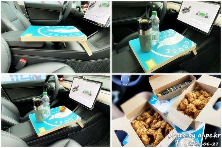 1열에서 중앙 콘솔박스 위에 테이블 올리고 간식 먹기~ 커피, 탄산수와 천도복숭아ㅋ