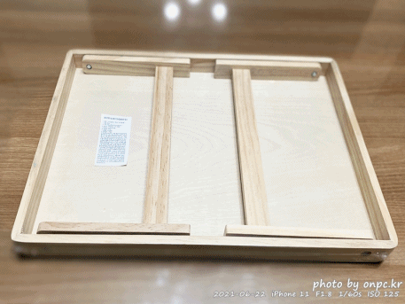 우드 접이식 테이블의 다리를 접고 로우 모드로 사용할 때 모습이에요.