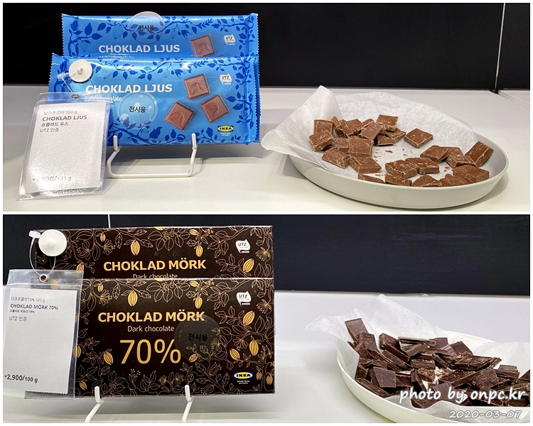 밀크초코바 100g. 가격은 1,500원 / 다크 초콜릿 70% 100g. 가격은 2,900원