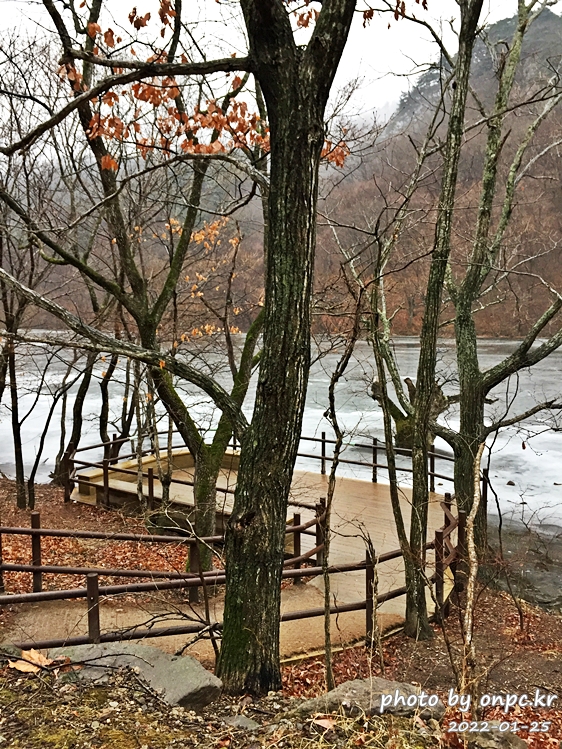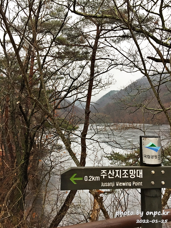 15분 정도 올라오면 정면으로 멋진 주산지의 풍경이 펼쳐집니다. 물 위에는 살짝 살 얼음도 보이네요.