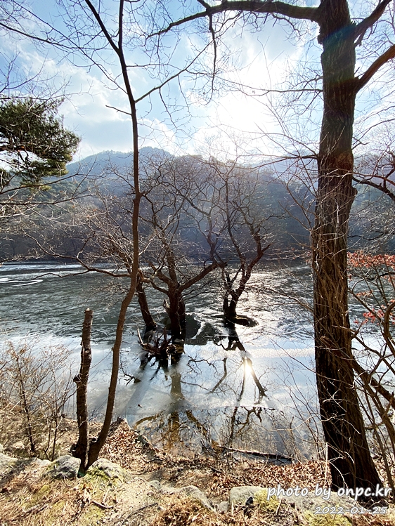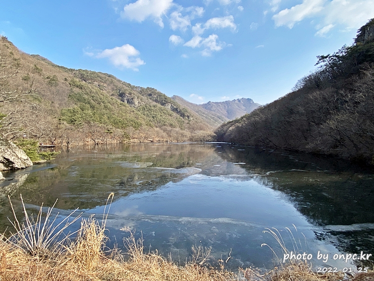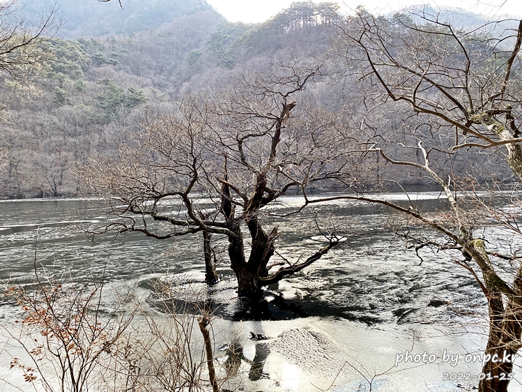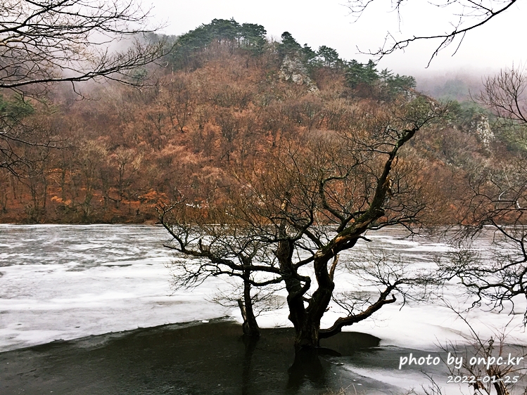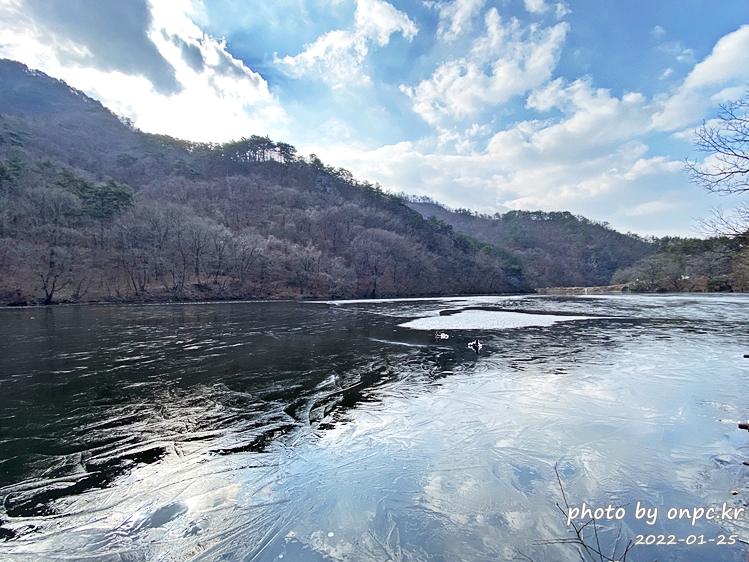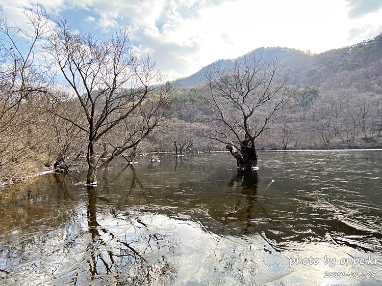 여름에 가물면 상류 쪽으로 바닥을 드러내는 경우도 있는데 겨울이라서 주산지 수위가 높네요.