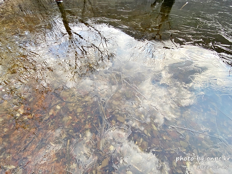 물 위에 떨어진 낙엽들 위로 얇게 언 얼음이 살짝 덮었어요. 살 얼음 속 붉은 낙엽도 아름다워요~
