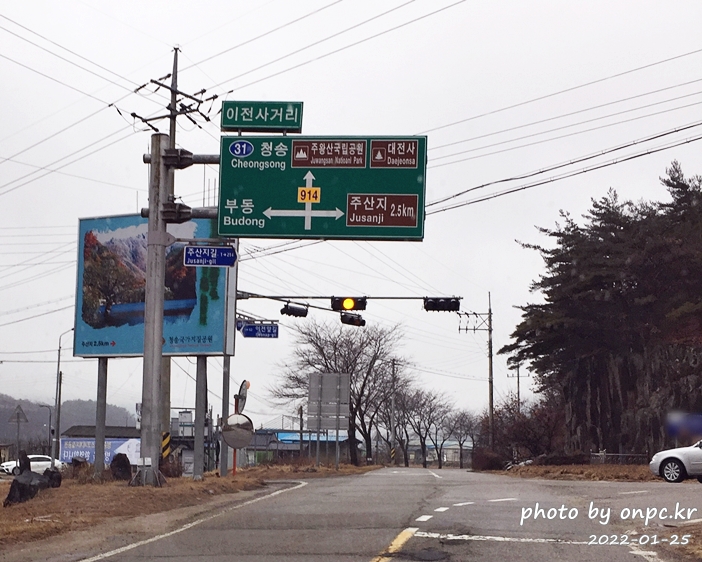 이전 사거리 직진하면 주왕산 국립공원~ 우회전하면 주산지. 주산지까지는 2.5km.