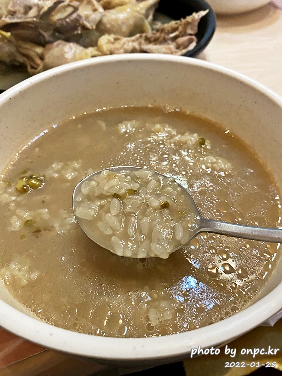 닭백숙과 나온 죽이에요. 달기약수로 끓여서 색이 진합니다. 녹두가 들어간 죽이에요~