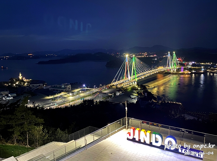 낮에는 병풍 같은 멋진 풍경을 해가지면 반짝이는 조명으로 화려하고 아름다운 밤 풍경을 즐길 수 있는 진도타워와 진도대교!