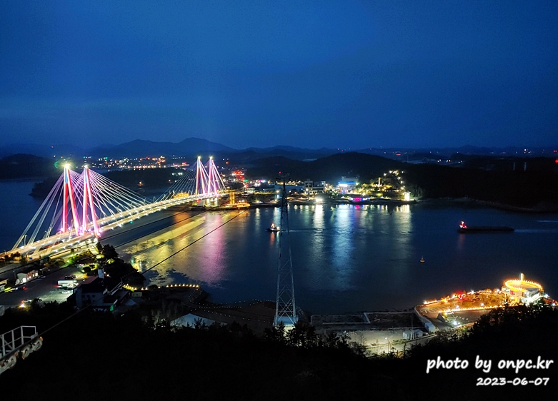 낮에는 해상 케이블카와 다리 아래의 울돌목이 장관을 이루고 밤에는 야경이 아름다움 선사합니다.
