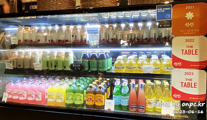 병에 담긴 착즙 음료와 다양한 음료 메뉴~