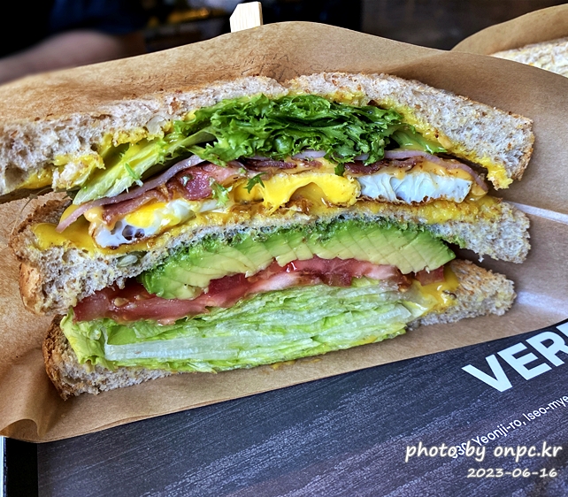 샌드위치에는 아보카도, 에그, 햄, 토마토, 앙상추 등 채소가 듬뿍 들어 있어요.