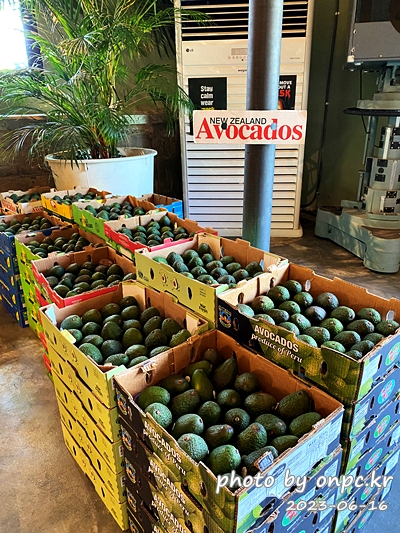 아보카도 시그니처 메뉴를 선보이는 카페답게 뉴질랜드 아보카도가 박스가 겹겹이 쌓여있어요.
