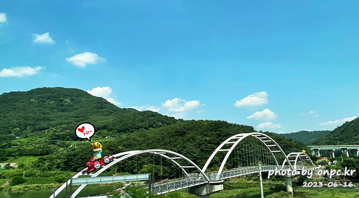 경북 청도에 들어서면 다리 위에서 레일바이크를 타고 손을 흔드는 귀여운 소 캐릭터를 만날 수 있어요.