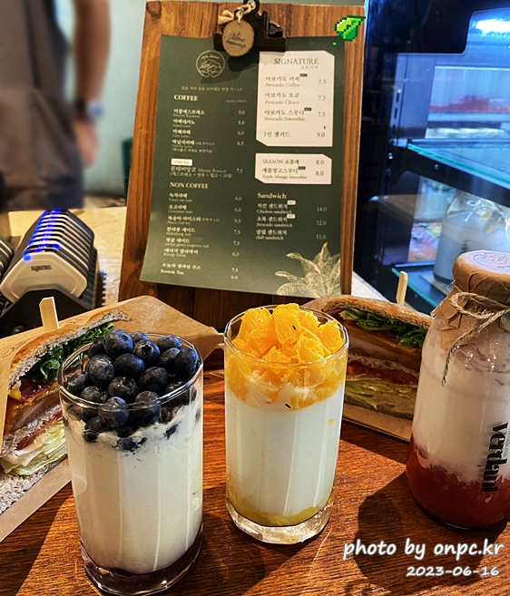 시그니처 메뉴인 아보카도를 활용한 초록 샌드위치나 초록 커피, 앙버터, 쿠키 등 전반적으로 맛있고 가격도 만족해요.