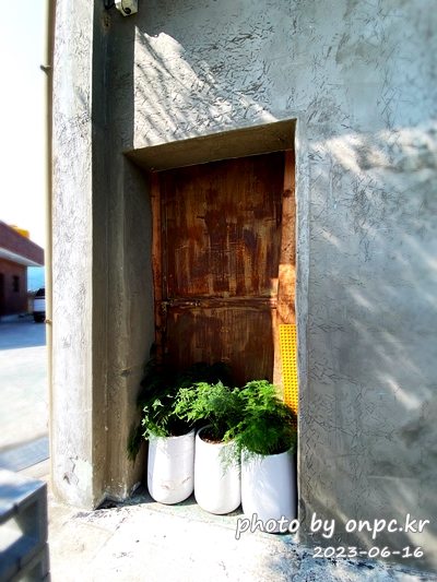 카페 출입문과 안내판은 녹슨 철판을 이용한 인더스트리얼 인테리어가 눈에 띕니다.