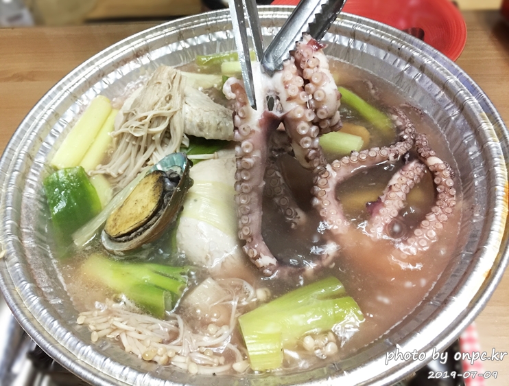 전복, 낙지, 대파와 팽이버섯까지 골고루 담고 국물도 담아서 푸짐하게 한 그릇 담아냈어요.