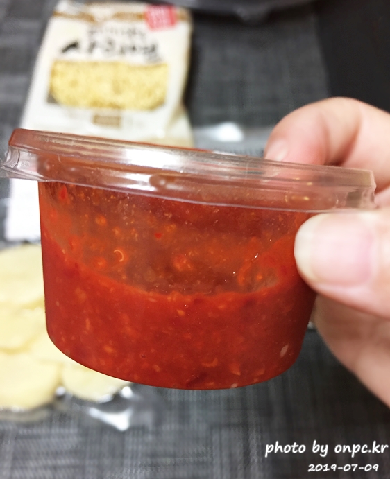 닭 가슴살은 매콤한 맛이 나는 다진 양념에 찍어먹으니 맛나네요.