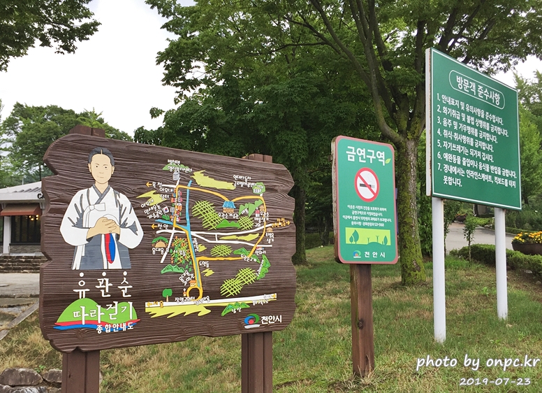주차장 옆 유관순 따라 걷기 종합안내도, 방문객 준수사항, 금연구역.