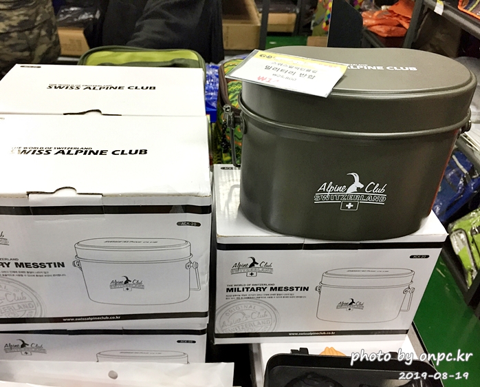 불쏘시개, 미니화로, 스위스 알파인 클럽(Alpine club) 밀리터리 반합, 가습기, 스티커 등이 진열되어 있고