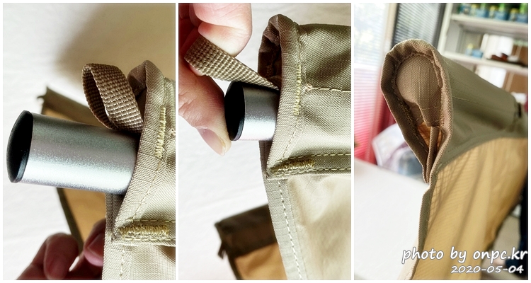 지지대를 시트에 끼울 때 한쪽에 세 군데 통과해야 하는 구멍이 있어요. 지지대가 통로를 통과 못하고 두 번째 사진처럼 밖으로 빗나가며 이탈하는 경우가 자주 생기는 점! 잡아주는 이가 있으면 편한데 혼자서 조립할 때는 왔다 갔다 해야 하는 불편함이 있습니다. 지지대가 구멍에서 이탈되지 않게 한쪽에만 천을 덧대 준다면 얼마나 좋을까? 아쉬움이 남는 부분이에요.