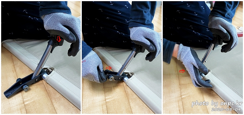 첫 조립 팁: 일어서서 다리사이에 시트를 끼우고 상체의 몸무게를 이용해서 눌러주면 조금은 쉽게 됩니다.