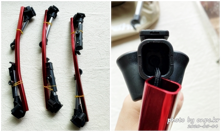 사이드 메인 지지 폴대 4단 접이식 x 2개. 연결 부위는 탄력 고무밴드로 되어 있습니다.