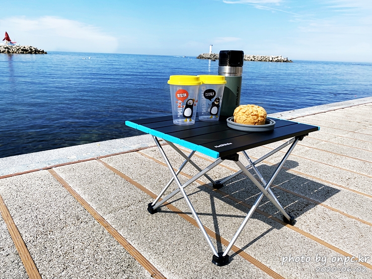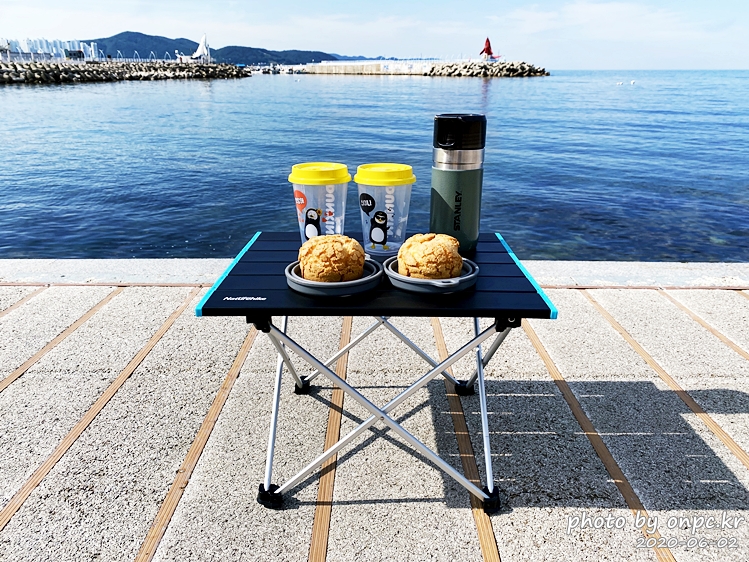 먼저 사이즈가 제일 작은 NH 트레킹 테이블 위에 텀블러 2개, 보온병 1개, 빵 2개를 얻어봤습니다.