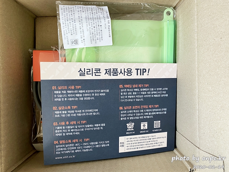 실리콘 사용에 관한 팁이 적힌 종이와 실리콘 그릇이 들어있습니다.
