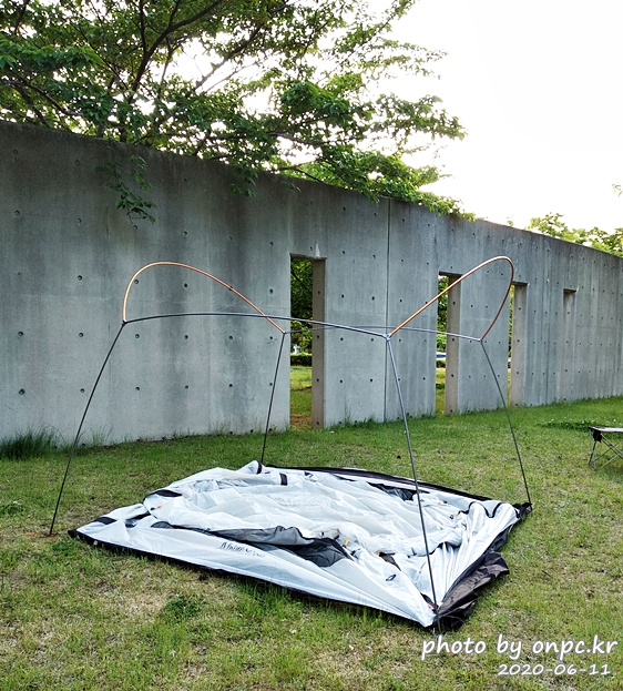 두 개의 폴대를 쉘터에 꽂은 모습. 자립형 쉘터라서 한쪽면 두 개 폴대만 연결해도 모양이 반은 잡힌 상태예요.