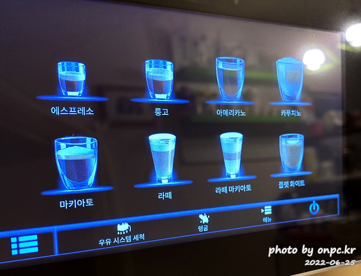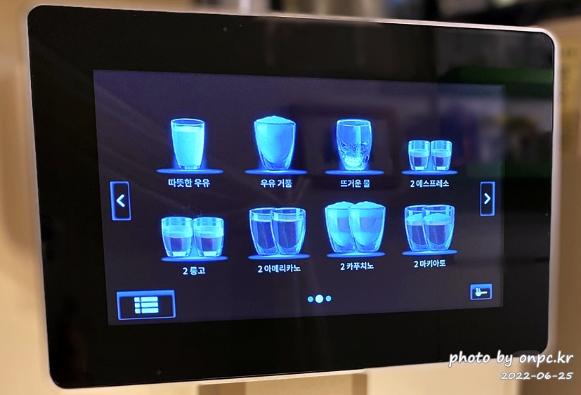 다양한 커피, 음료를 화면에서 쉽게 선택하고 온도, 원두양, 커피 추출량, 물 온도, 우유 거품 등 모든 부분을 조절해요.