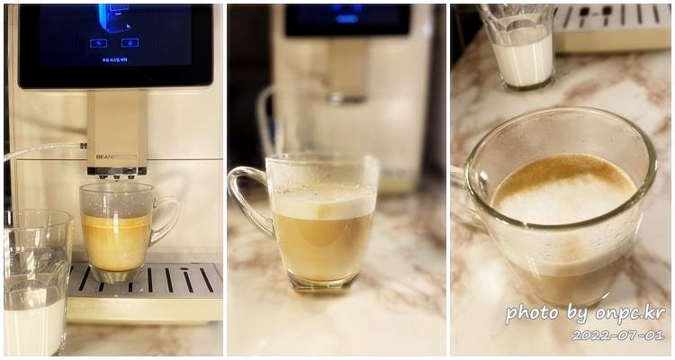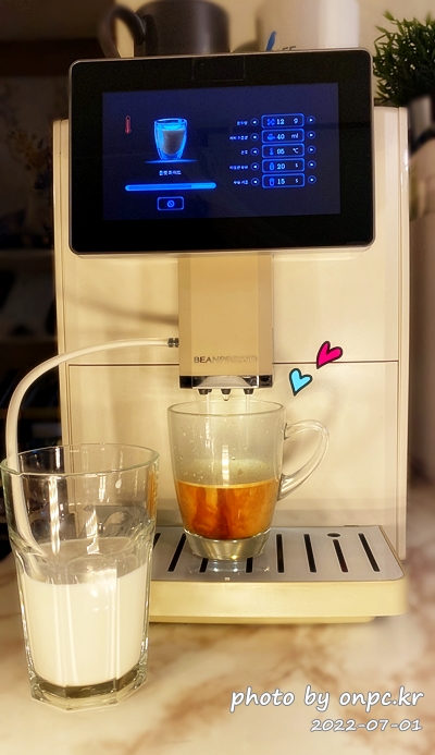 우유가 얼마 남지 않아서 라떼 마키아토로 추출해봤어요. 남은 우유는 알아서 전부 소진하면서 추출하네요~