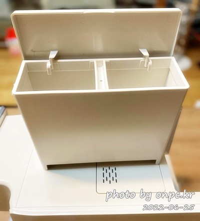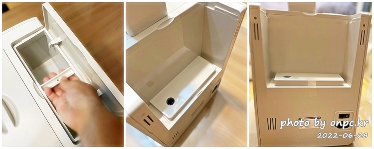 물 받침대를 잡고 앞으로 당기면 전체가 통으로 빠집니다. 중간에 가림막이 있고 물 넘침 방지인가 덮개도 있어요.