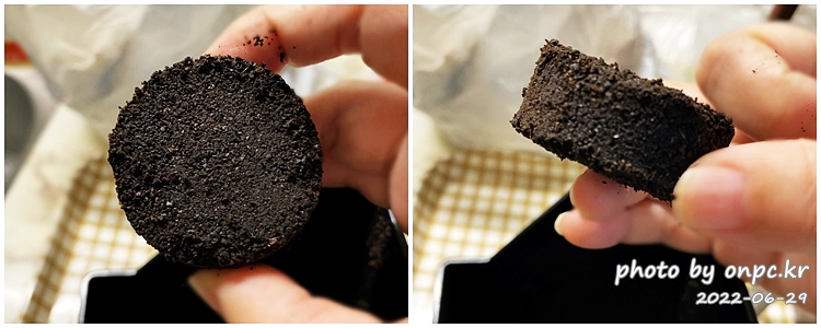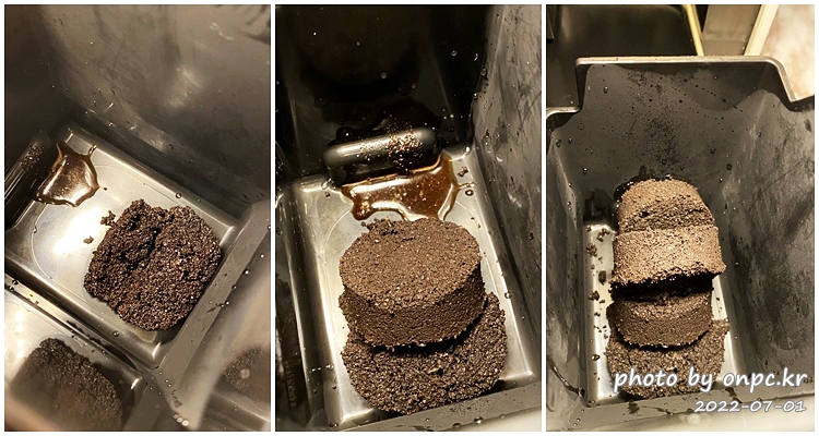 커피 찌꺼기 커피퍽도 단단하게 제법 잘 나왔어요. 처음엔 물퍽이 꽤 나왔는데 조절하면서 뽑아보니 이 정도면 괜찮네요.