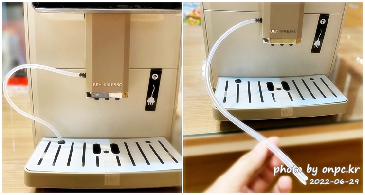 스팀 노즐 방식이 아니고 우유 튜브가 장착되어 있어요. 우유 거품과 라떼도 한 번에 가능해요~
