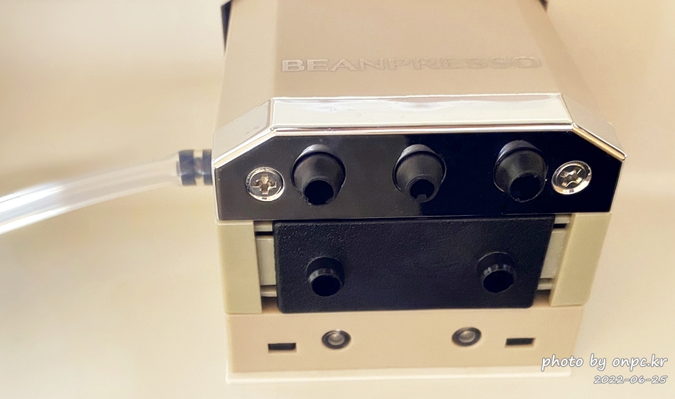 우유 튜브를 추출기 옆 튜브 홀에 꼽고 한쪽은 물 받침대에 꼽아서 설치합니다.