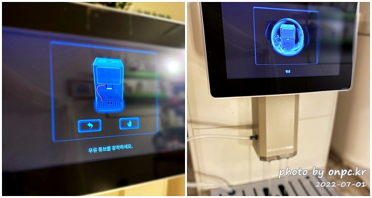 우유 튜브를 장착하고 OK~ 버튼을 누르면 우유 시스템 세척 모드~