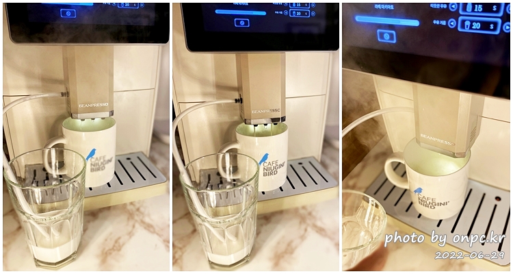 스팀 노즐 방식이 아니고 우유 튜브가 장착되어 있어요. 우유 거품과 라떼도 한 번에 가능해요~