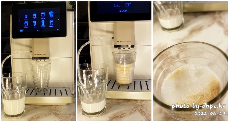 우유가 얼마 남지 않아서 라떼 마키아토로 추출해봤어요. 남은 우유는 알아서 전부 소진하면서 추출하네요~