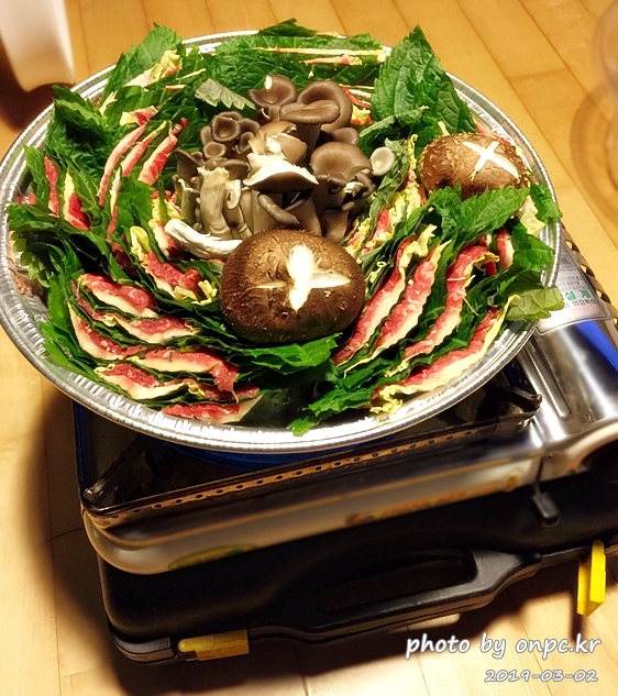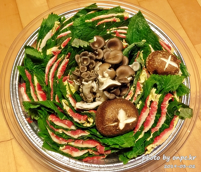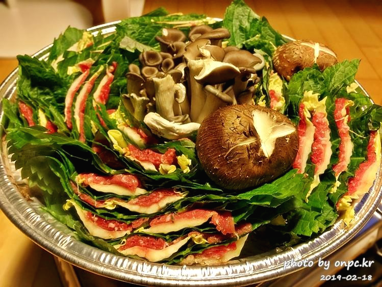 중앙에 느타리버섯, 표고버섯은 +로 장식하고 들깻잎과 알배추를 소고기와 한겹 한겹 겹쳐서 잘라 한 바퀴 돌려놨네요~