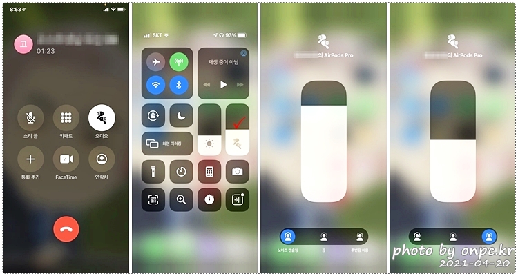 에어팟 프로를 착용하고 통화할 때 아이폰에 표시되는 화면과 폰에서 노이즈 캔슬링과 주변음 허용 모드를 조절할 수 있어요.