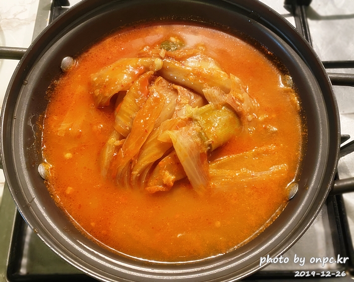 약 6분간 끓여주면 김치찜 완성. 얼큰해 보이는 빨간 국물~