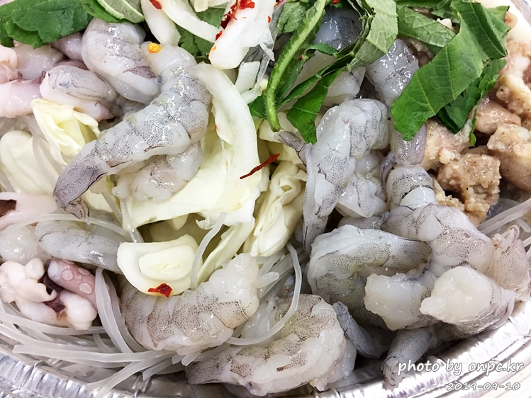데친 낙지(태국산), 소곱창(호주산), 새우(태국산), 양배추(국산), 당면, 채소+우동사리면