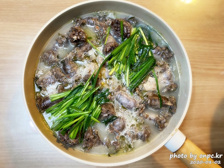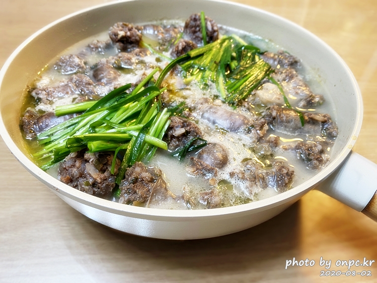 코스트코 부추 고기 순댓국을 부추 추가로 더 넣고 프라이팬에서 조리해봤어요.