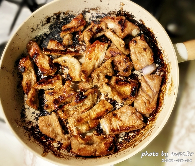 양념 있는 돼지갈비를 프라이팬에 구워봤어요.