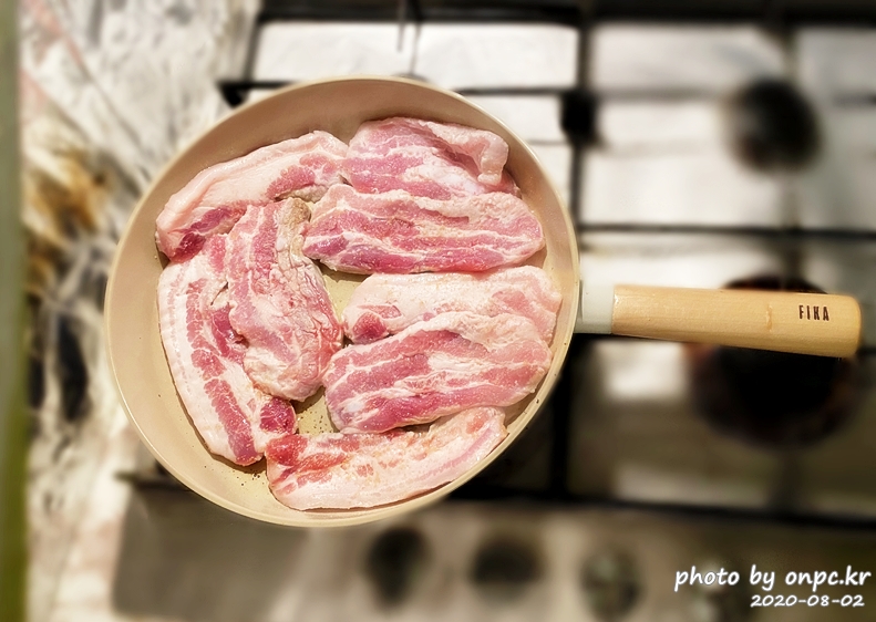 28cm 프라이팬에 삼겹살 4줄을 반으로 잘라서 구웠어요.